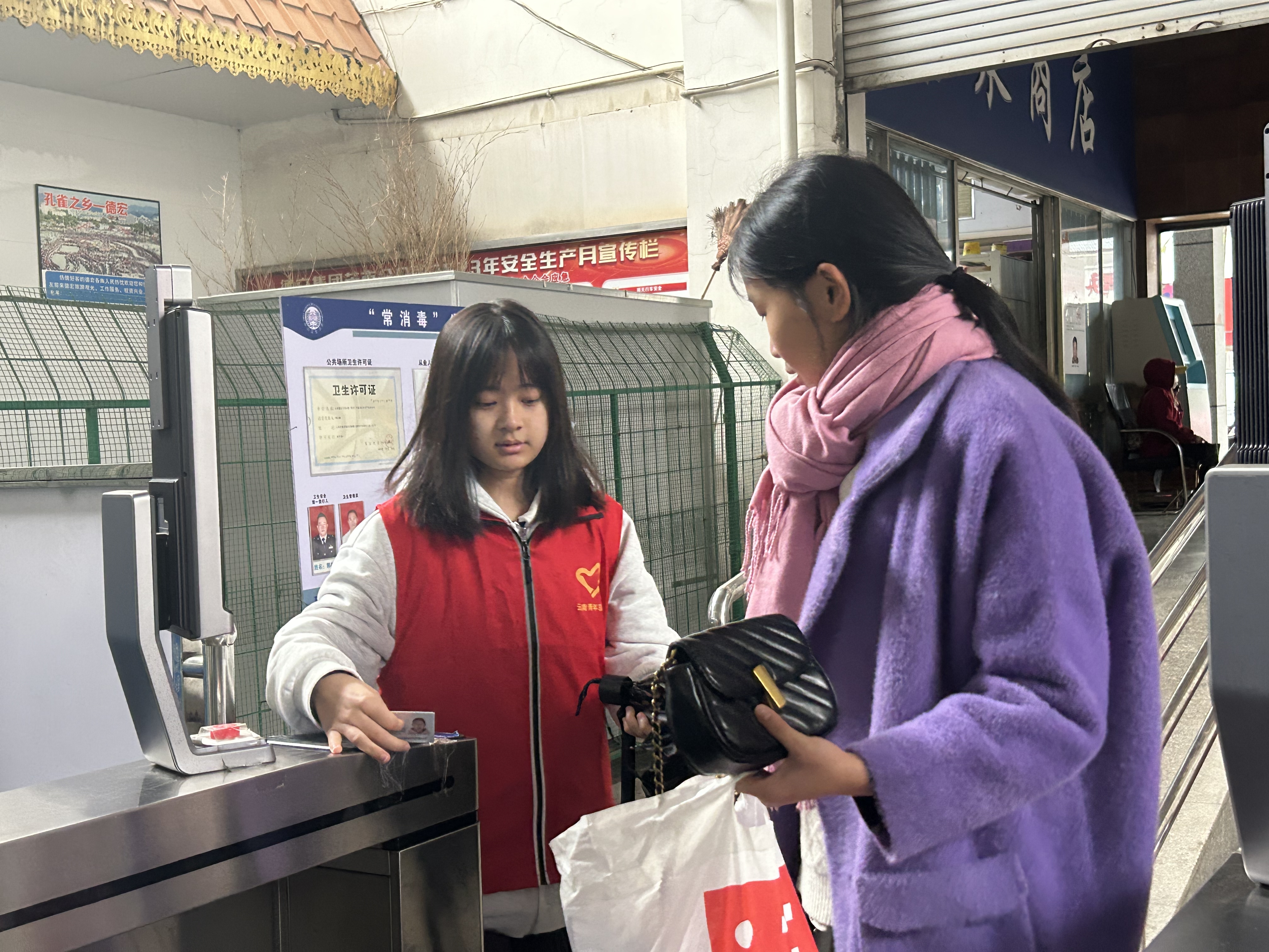 春运首日,芒市北部汽车客运站人流如织,身着“红马甲”、佩戴“红绶带”的志愿者积极配合客运站工作人员,开展安检协助、文明劝导、进(出)站引导等工作,为广大旅客特别是“老幼病残孕”等重点群体提供票务协助、候车引导、行李搬运、无障碍通行等温馨服务,用饱满的热情和贴心的服务温暖旅客的回家路。