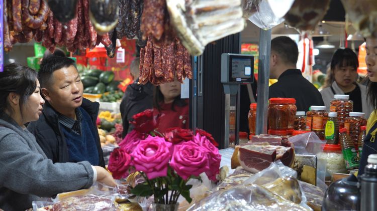 卖腊味的张阿姨正手脚麻利地给客人称重,她的脸上挂着热情的笑容,嘴里还不忘介绍着:“过年嘛,腊味是必不可少的,这些腊味都是我们自家精心腌制晾晒的,味道纯正,无论是炒菜还是清蒸,都特别香!”