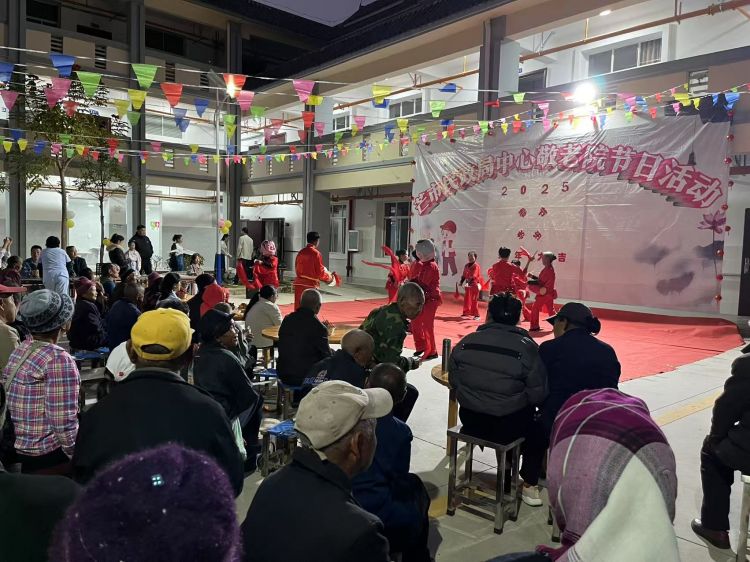 饭后,随着欢快的音乐响起,文艺表演正式拉开了序幕。舞台上,歌舞表演精彩纷呈,演员们服装鲜艳,随节奏起舞,传递着喜悦。老人们也被这浓厚的氛围感染,脸上露出了开心的笑容,有的还跟着节奏轻轻摇摆身体。