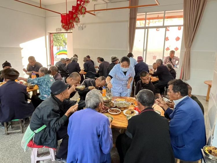 随后的团圆年夜饭将气氛推向高潮。精心布置的食堂温馨满满,丰盛的年夜饭摆满了餐桌,不仅有老人们平日里喜爱的菜品,还融入了过年的特色美食。工作人员和老人围坐,边吃边聊,温馨又温暖。
