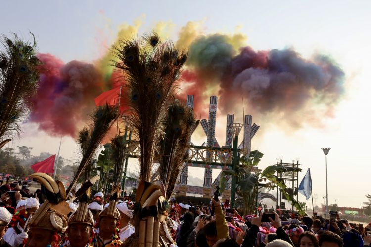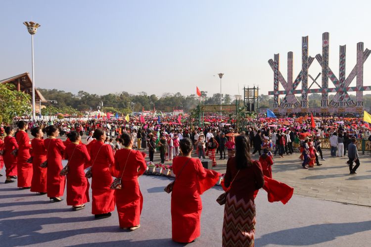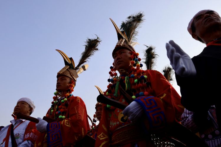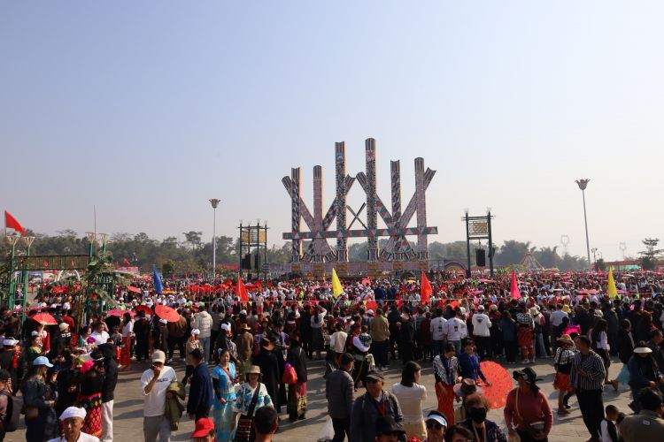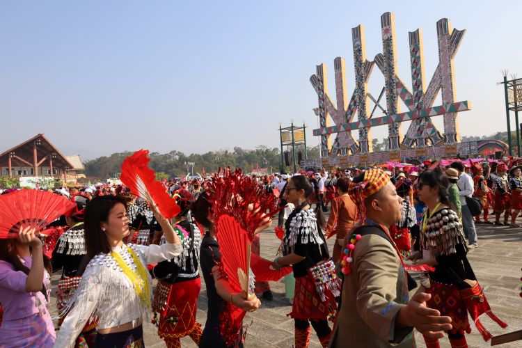 高亢激昂的鼓点响起,上万名各族群众穿着绚丽多彩的节日盛装,在“瑙双瑙巴”的带领下,围着目瑙示栋纵情歌舞,沉浸在欢乐的节日氛围中。