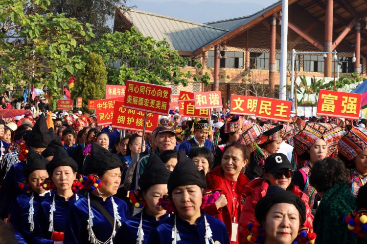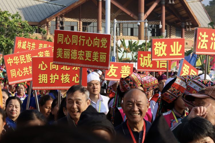 芒市委书记谢金翔致辞。他说,党的十八大以来,在以习近平同志为核心的党中央坚强领导下,各族群众像石榴籽一样紧紧抱在一起,在团结奋斗中共享发展成果,中华民族共同体意识扎根于各族群众心间,凝聚了共促中华民族伟大复兴的磅礴力量。今天,全省各族同胞带着独特的文化和风采共赴芒市之约,踏着高昂激情的鼓点,唱响民族团结进步之歌,跳起盛世团圆幸福之舞,携手绘就中华民族和衷共济、繁荣昌盛的崭新画卷。