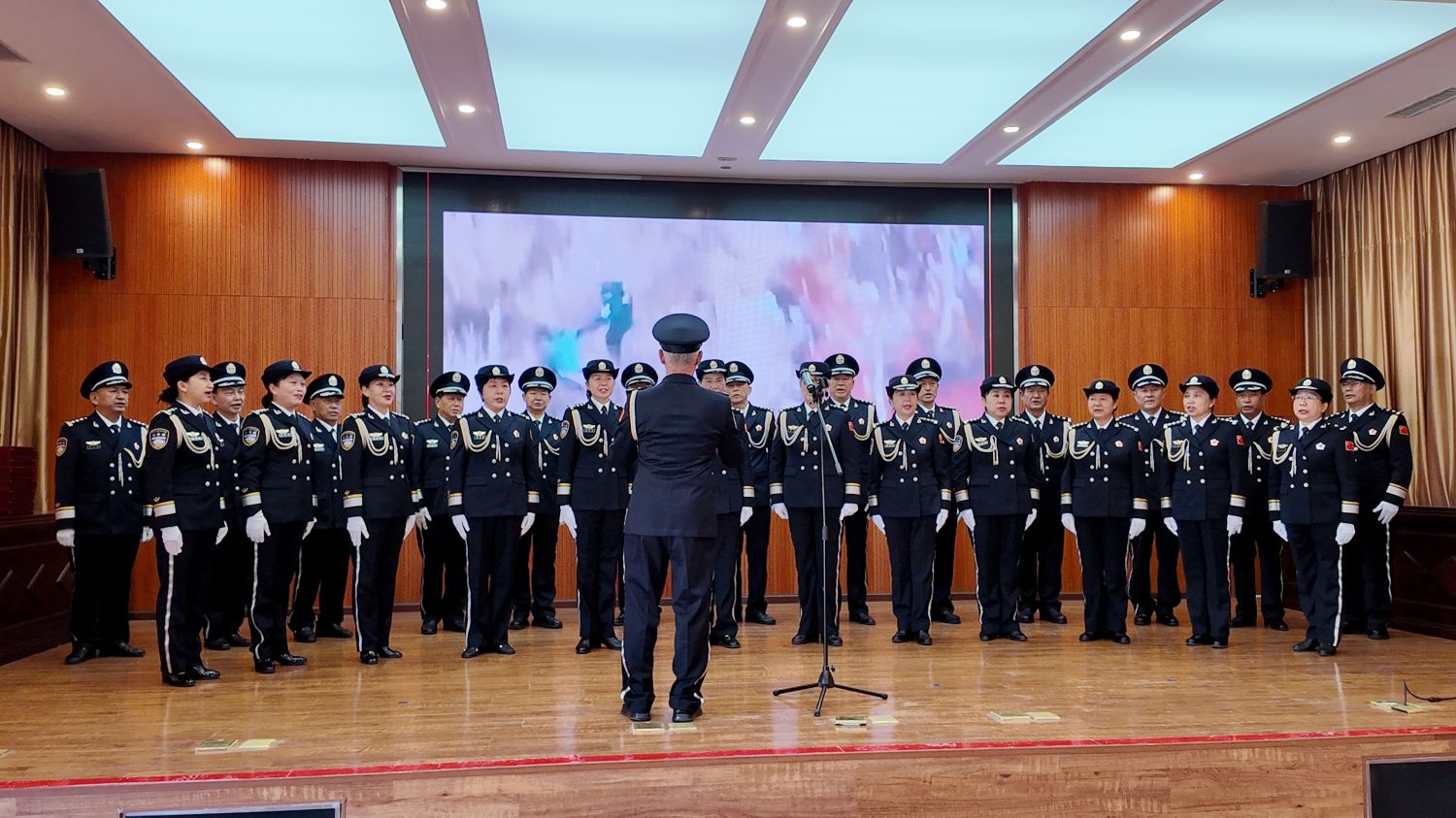 退休党支部的老民警们身着整齐服装登台,合唱经典曲目《当那一天来临》。激昂的旋律响起,老民警们眼神坚定、歌声铿锵,用真挚情感唱出对公安事业的赤诚眷恋,彰显“离岗不离党、退休不褪色”的初心本色。