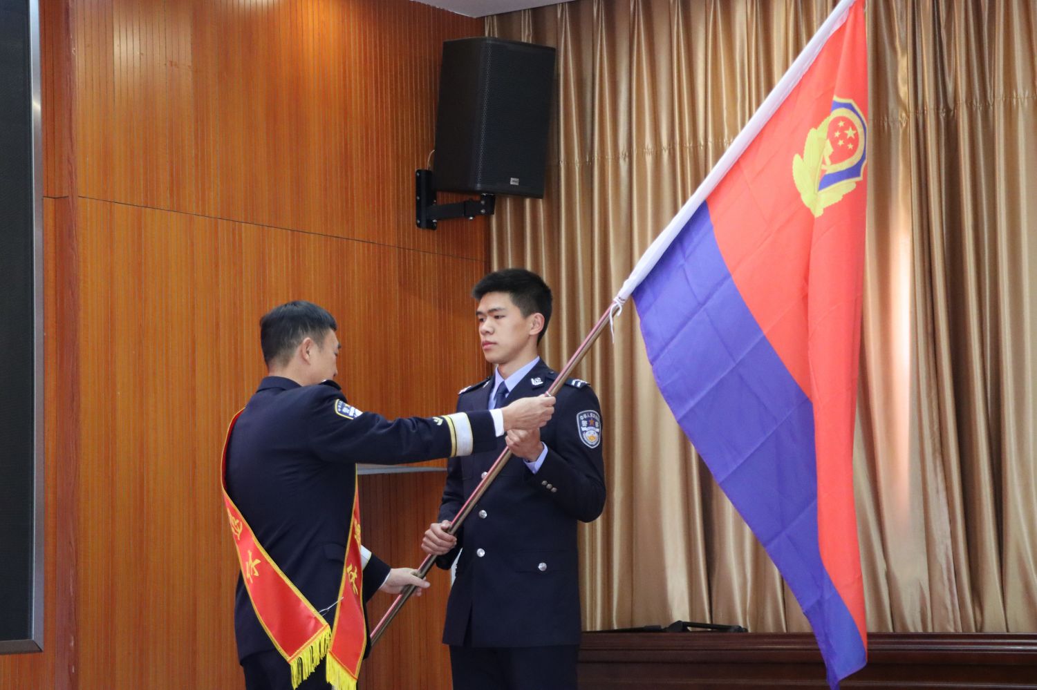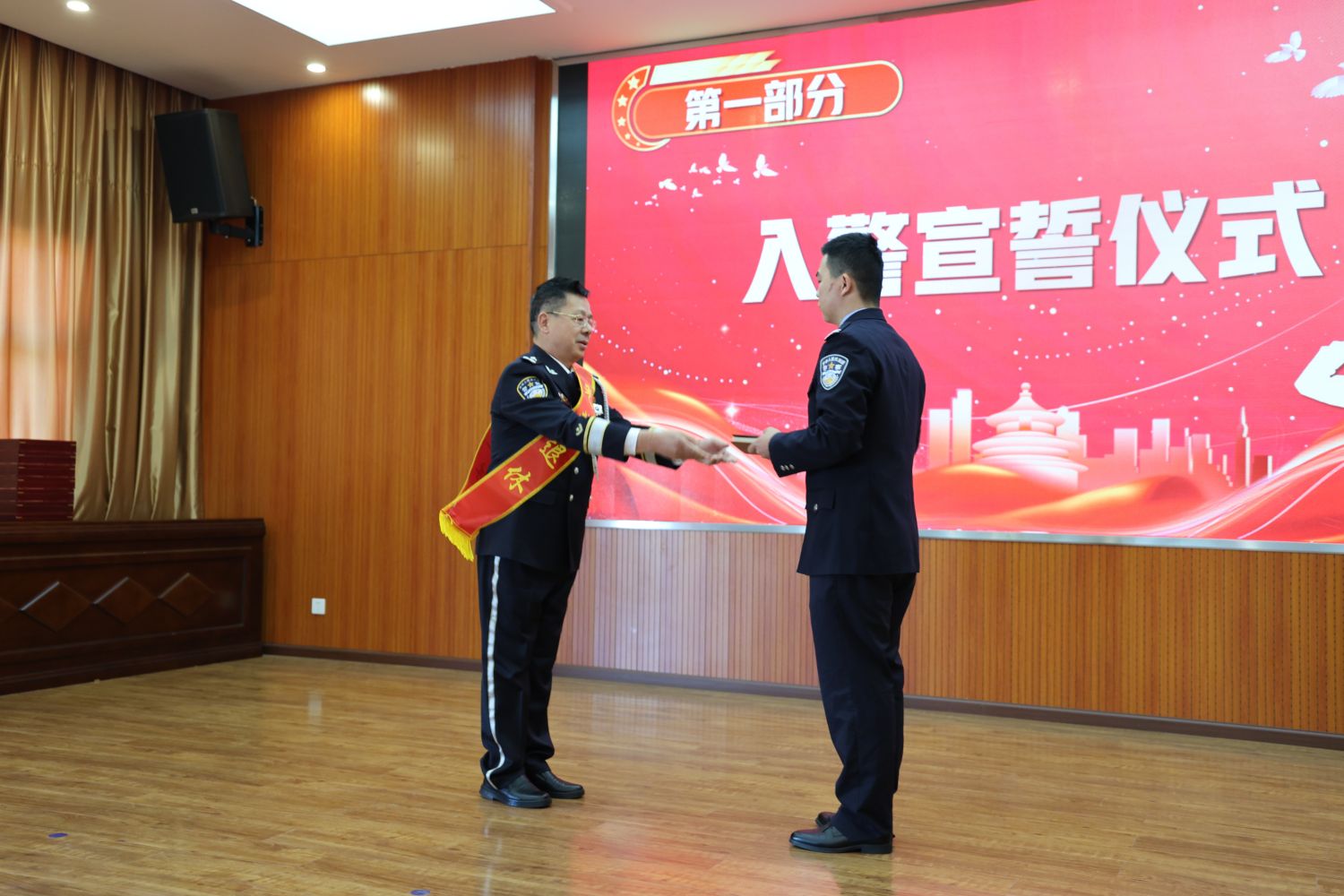 寓意深刻的传承交接仪式上,退休民警代表手持象征责任与使命的警旗及承载着工作经验的工作日志,郑重交予新警代表。