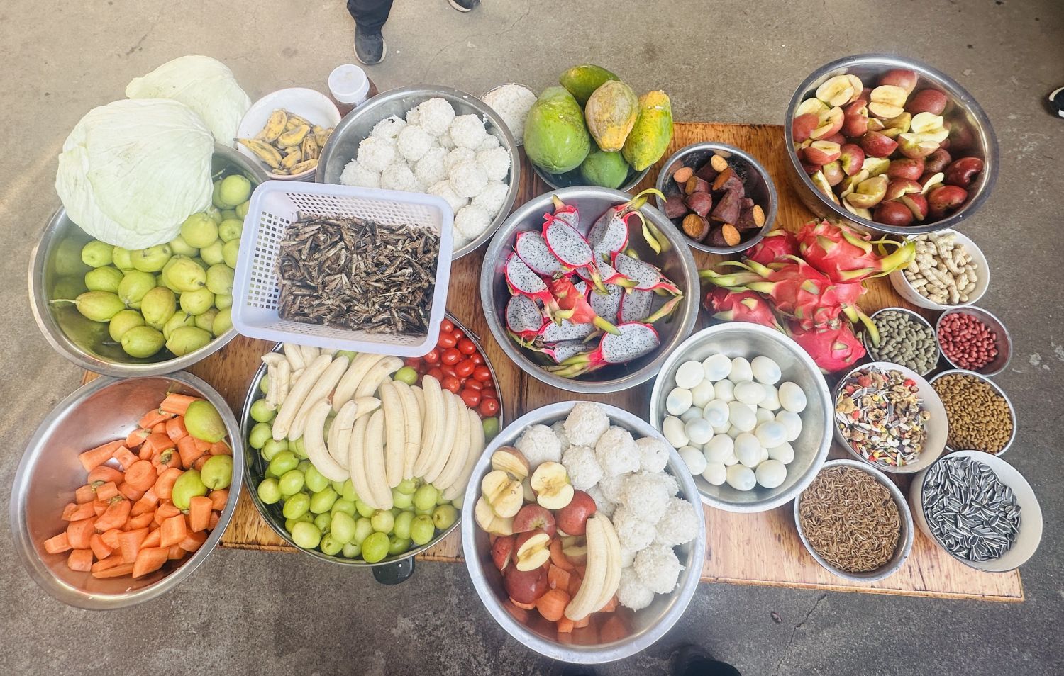 炊烟升起的后厨里,这场宴席的准备工作有条不紊地进行着。香蕉、苹果切配拼成果盘;面包虫、蝗虫被仔细挑选、清洗;捏成团的米饭与鸡蛋、鸡胸肉分装成盒。工作人员依照东白眉长臂猿、白鹇、赤麂的不同食性,为这里收容救护的495只野生动物量身定制专属套餐。每一份“年夜饭”,都是经过细致的营养配比。![]()