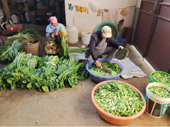 80后的冯咩涛家,从老人一代就开始做水腌菜,已有30多年的时间,她家主要做水腌菜、爆榨腌菜、笋子3种,这是全家人的主要生计。平时少时做400多斤,多时做3000多斤,平均每天做500斤、600斤水腌菜、爆榨腌菜。主要在芒市东风集贸市场销售,以前客户自己来家里买,主要是单位。现在大客户是配菜公司,每次基本都买几百斤。全年都卖,基本无休息时间。水腌菜每斤售价1元、2元,每天收入少时500多元,多时1000多元。冯咩涛家通过做腌菜生意,盖起了楼房,购买了车子,供养2个儿子读大学,全家人就靠这门手艺发家致富,日子越过越红火。