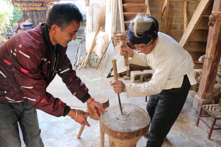象脚鼓就地取材,是他亲手栽种的杉木树,从一棵树变成精美的象脚鼓,需要时间与耐心的细致打磨。制作象脚鼓的步骤十分复杂,仅仅是将整根木头凿出鼓身就需要一周时间。经过内部镂空、外部凿刻、纹路雕刻等多道工序,再将牛皮泡软、仔细打磨,用牛皮条或绳子固定住做成鼓面,并用颜料在鼓身画上黑红条纹的彩绘,极具德昂族特色。纯手工制作象脚鼓,光是工具就放满了两背篓。他如数家珍般介绍着各种各样的工具,刨子、凿子、锤子在他眼里像是相伴多年的老友。