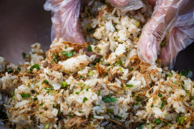 饭团裹着舂碎的牛干巴、缅芫荽、腰果、八担柴等。要先将牛肉干巴烤熟,再将牛干巴、大蒜、腰果、八担柴、缅芫荽也放入舂桶里一起舂碎。将米饭加入到舂好的配料中,洒上盐、味精揉搓入味。