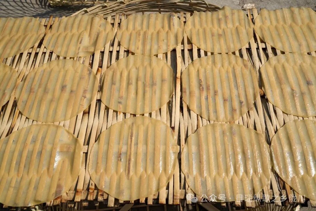 精选糯米浸泡整夜吸饱水分,次日蒸熟。同时,称适量红糖加水熬制化开,蒸熟的米趁热放入机器搅打成糍粑状,反复两至三次确保口感绵软。再将红糖水多次融入糍粑,手工揉捻至糖米交融、色泽莹润。糍粑揉好后装入缸内,放入大锅中用温水保温防止冷却变硬。随即取出半个拳头大小的糍粑团,沾上香油,既防黏,又增香,用擀面杖擀成薄如蝉翼的圆饼,铺满整张竹篾后,移至阳光下晾晒,定时翻面,让阳光锁住米香。