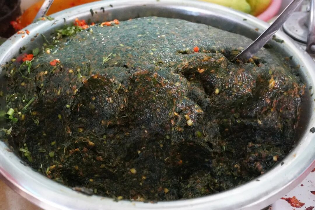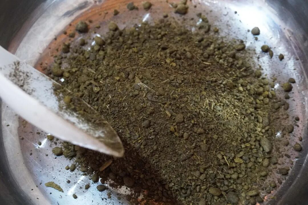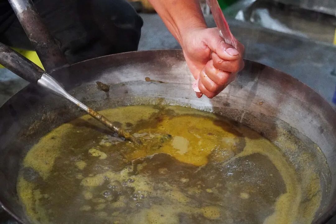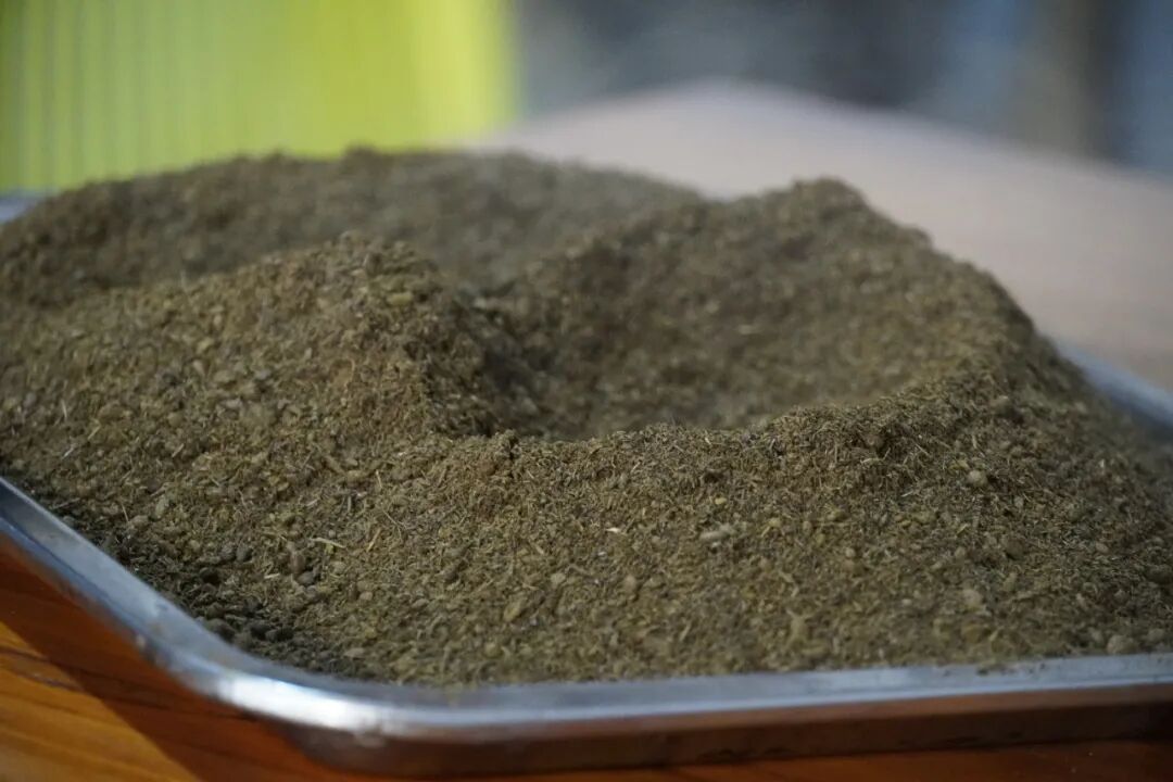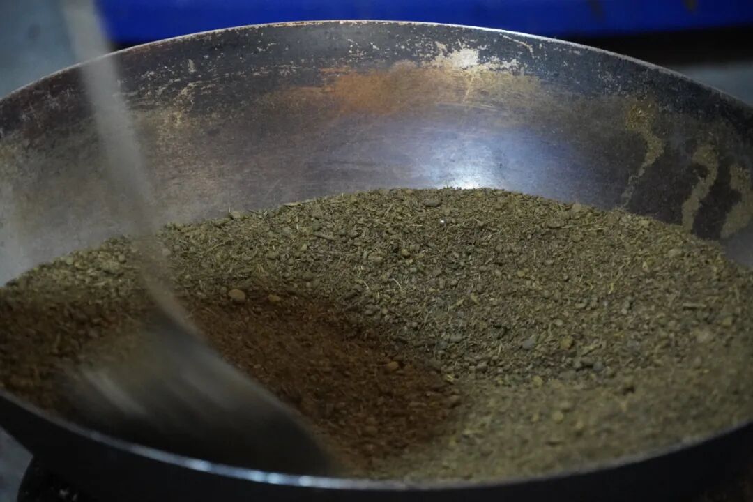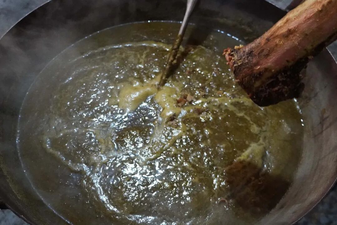 将滤出的草料汁倒入铁锅,小火慢熬,关键一步是加入橄榄树皮。橄榄树皮的清苦与草汁相融,中和腥气,增添醇厚回甘,是陇川撒苤独有的风味密码。全程小火慢搅,耐心熬至水分完全蒸发,草汁与橄榄树皮的精华浓缩成深绿色苦粉,盛出晾干密封保存,便是撒苤的“灵魂干货”。