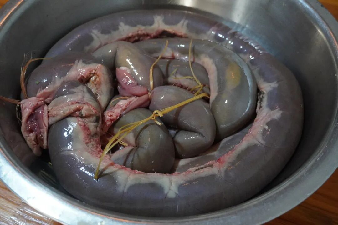 正宗苦水,只认清晨第一口鲜。选用清晨现杀的黄牛苦肠,这是牛消化百草的精华所在,带着山野草木的本真气息。先将苦肠反复清洗,褪去杂质,只留肠内未完全消化的草料汁——这是苦水的原生基底,藏着德宏山林的草木清香。