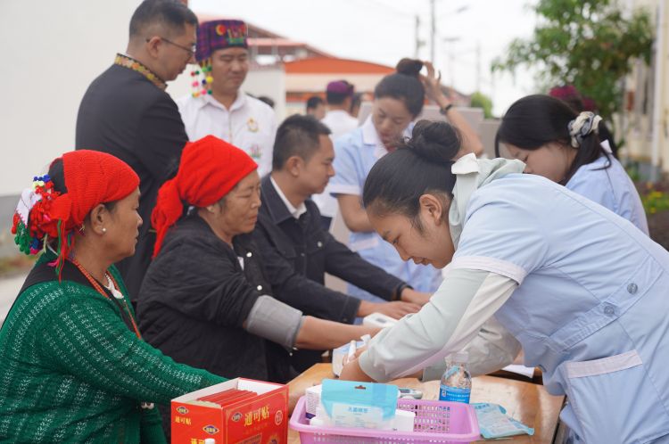 健康守护是最贴心的问候。省级医疗专家联合市中医傣医医院、户育卫生院医护及仁仁康大药房工作者,为老人测血压、查病情。免费理发点前,志愿者剪刀翻飞。83岁的傣族喊大妈摸着利落的短发直笑:“看诊学养生,还和老邻居唠家常,这节过得实在!”