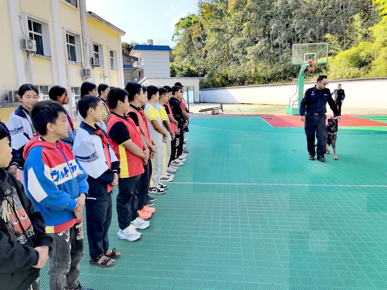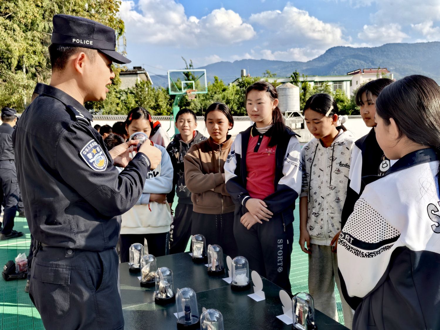 随后,民警带来警犬演练,在训导员指令下,“汪汪队”出色完成了基础服从、扑咬、模拟抓捕等科目,其灵活的身姿与精准的动作,引得同学们阵阵欢呼。在禁毒普法区,民警用生动活泼的语言,深入浅出地向学生们讲解“什么是毒品”“毒品的危害”以及“如何抵御诱惑、保护自身”等知识。通过现场提问、角色扮演等互动方式,学生们积极参与,在轻松愉快的氛围中将“珍爱生命、远离毒品”的理念深植于心。