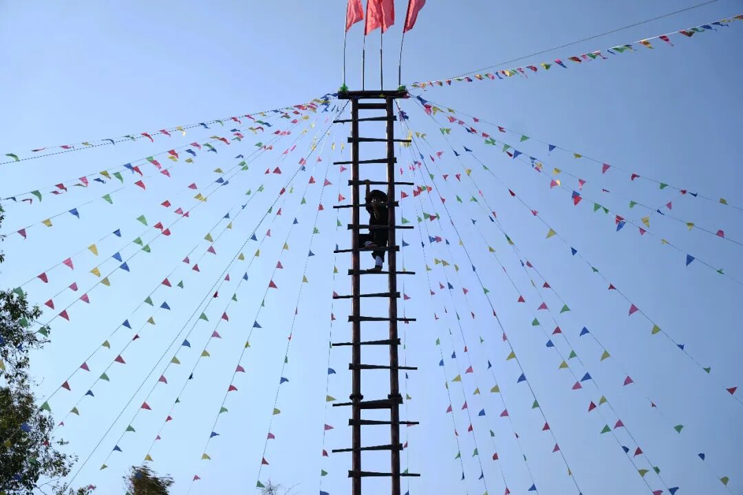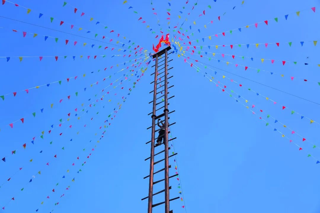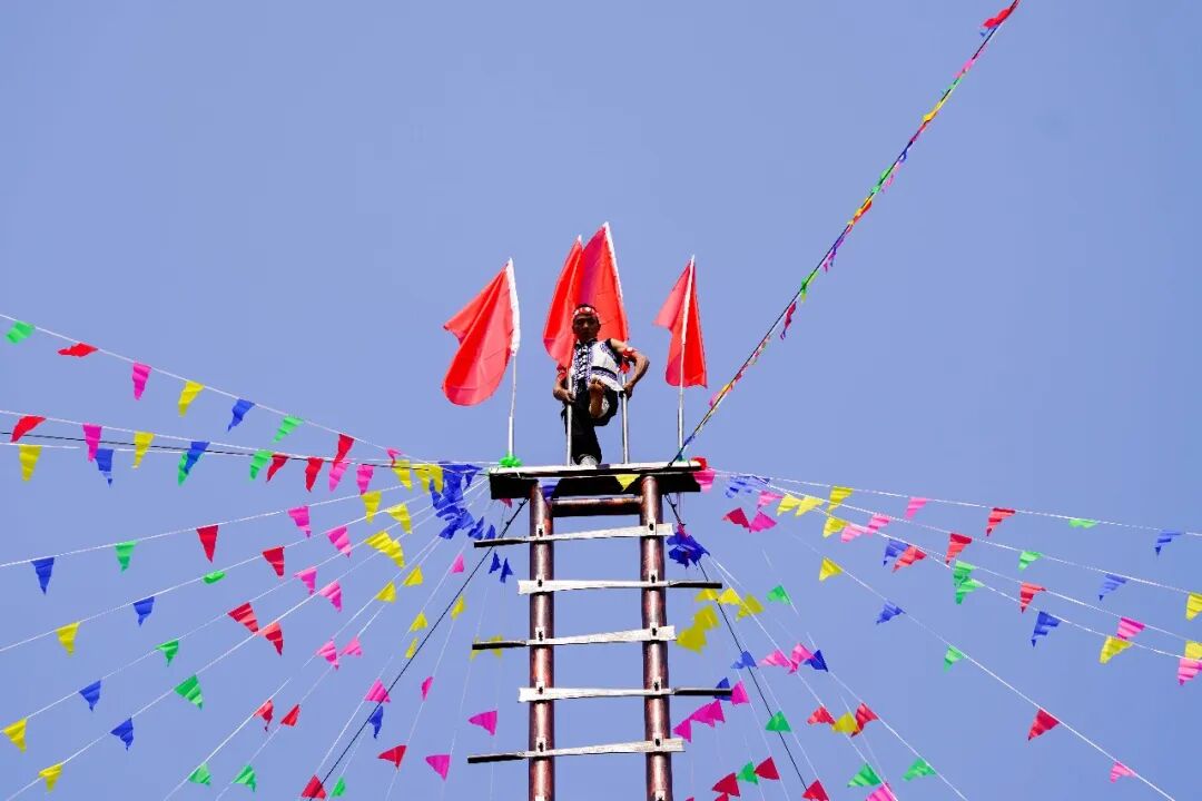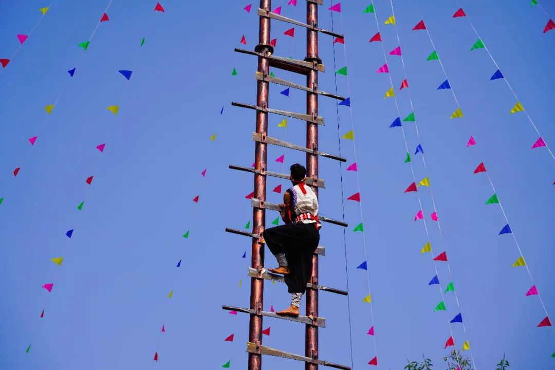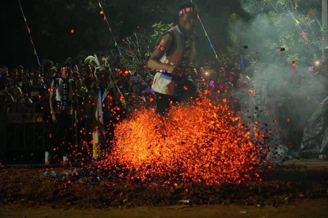 “上刀山”现场,36把寒光凛冽的钢刀整齐排列成刀梯,寒光灼灼、气势慑人,傈僳族勇士们神情沉稳、目光坚毅,不做任何防护便赤足上前,双手稳稳扣住刀梯扶手,脚掌从容踏在锋利的刀刃上,一步一步稳步攀升,每一步都沉稳有力,刀刃的寒光与勇士们坚毅的身影交相辉映,现场观众屏息凝神,唯有阵阵惊叹与掌声冲破寂静,精湛的绝技与无畏的气魄,赢得现场观众雷鸣般的掌声。