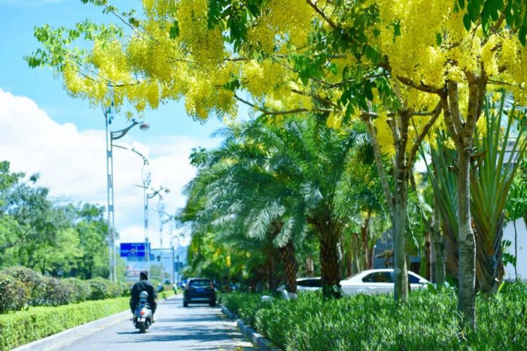 2. 留意地面“金毯”:微风吹过,花瓣如雨飘落,地面铺就的金色花毯是另一道迷人风景。