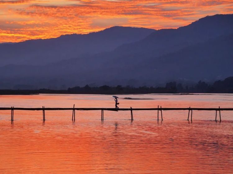 夕阳把竹桥浸在蜜色里