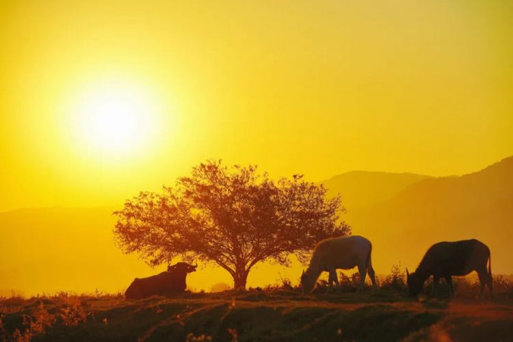 那吃草的牛儿驮着橘红霞光