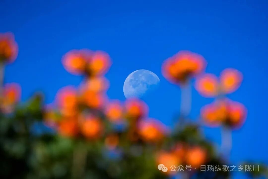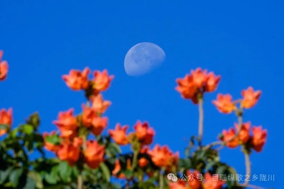 火焰花的枝桠交错缠绕,恰好给悬在半空的月亮搭了个精巧的“花架”。月的清冷、花的炽热、晨光的温暖,在朦胧晨雾中奇妙地交融,分不清是月光浸软了花红,还是阳光焐暖了月色。这花,多像陇川人骨子里的韧劲——明知寒冬将至,偏要以一朵花的炽热,把萧瑟冬日过成生机盎然的春天。
