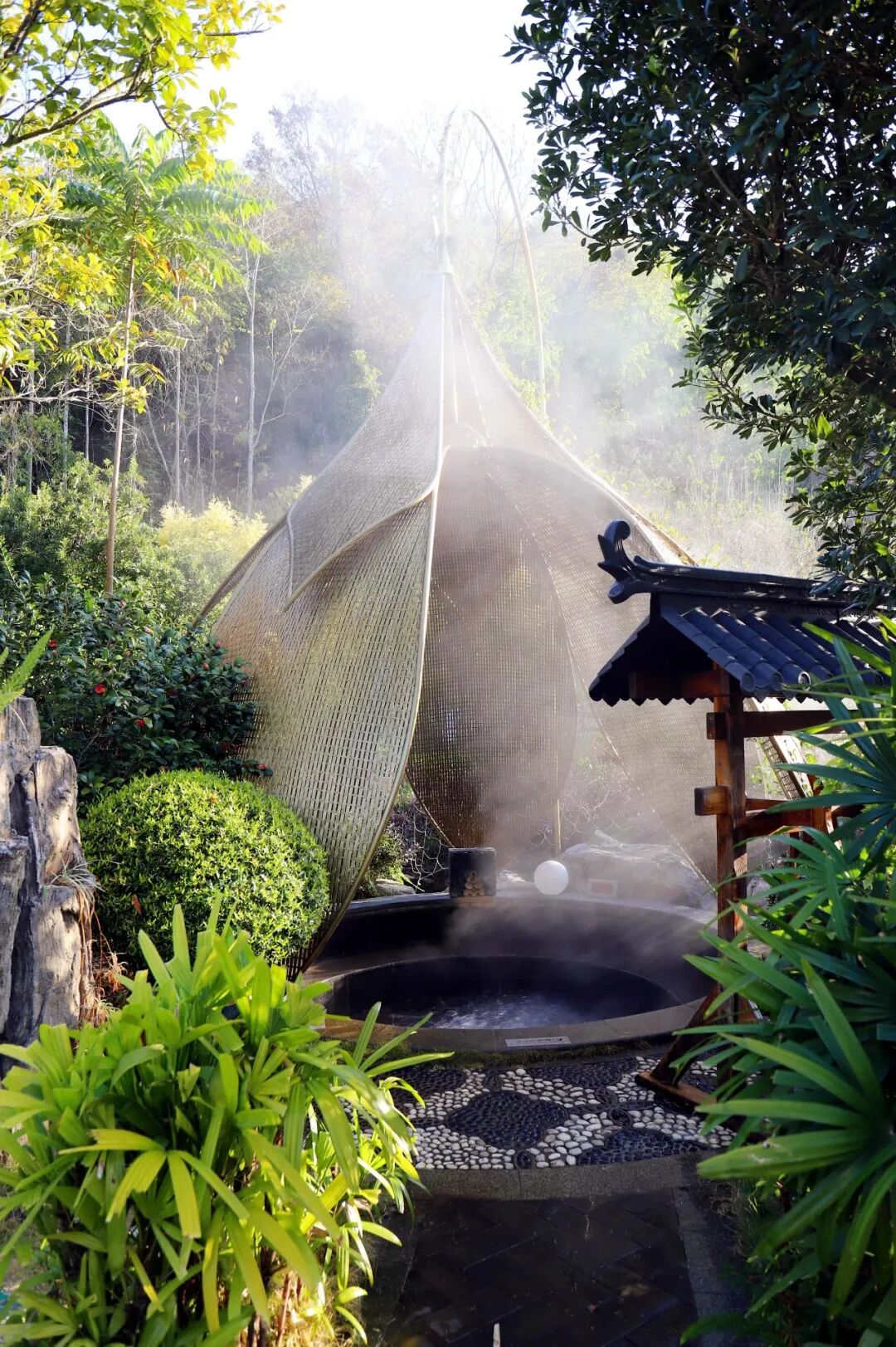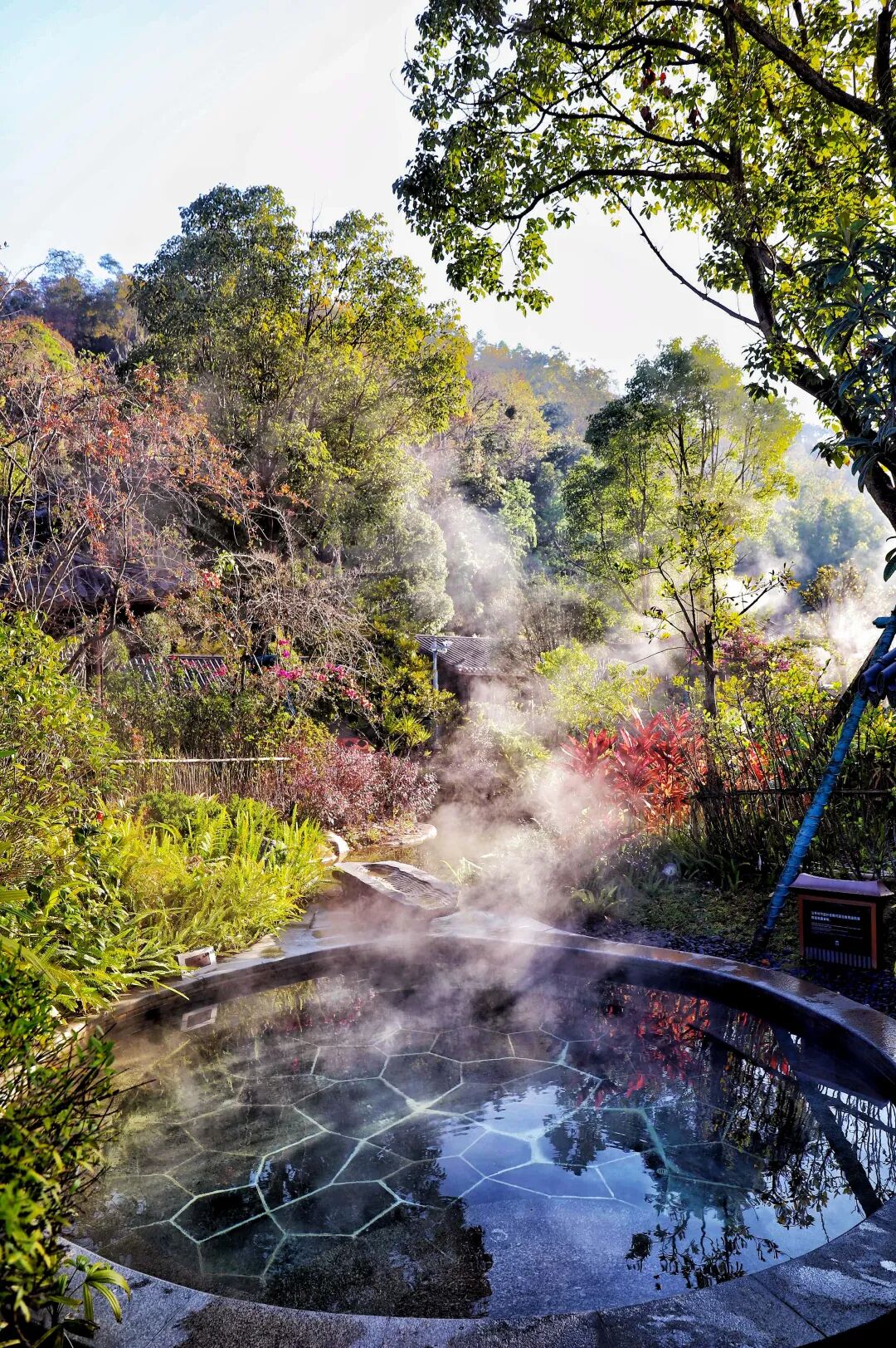 多个特色汤池散落在绿意之间