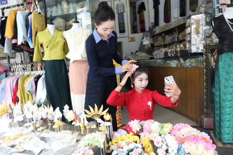 石莹芳说:“每年泼水节前,我都会和小伙伴相约缝制一套傣装,过泼水节的时候统一走在大街上,那叫一个齐整!”来自芒市镇的孟喊静在一旁点头:“下芒排村那群小姐妹天天催我,说我再不回,她们都挑不出裙子的花样了!”