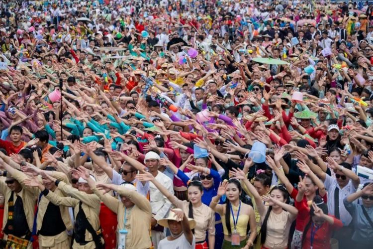 泼水节是傣族和德昂族最盛大、最隆重的传统节日,也是德宏州各族群众大团结、大联欢的盛会。按照传统,这一天,各族群众都会穿上盛装相约广场,敲起金铓锣,打起象脚鼓,纵情狂欢,用泼水的方式互相传递美好祝福。