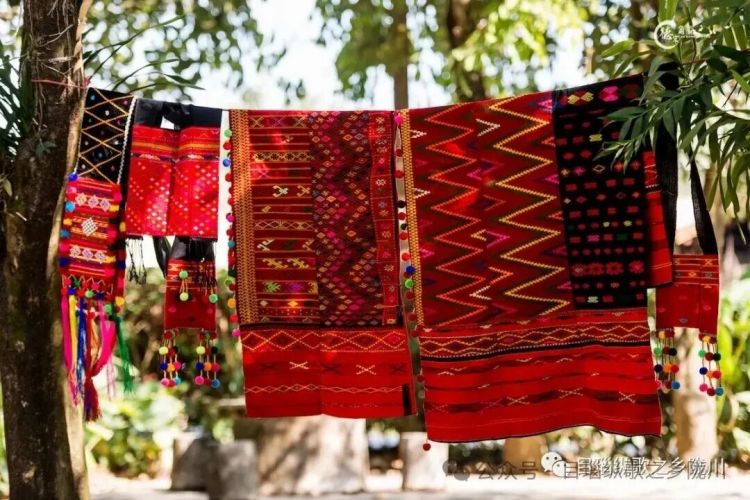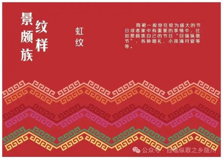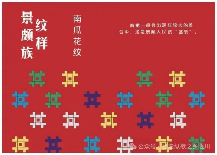 在景颇族服饰中,女性服饰图案较为华丽绚烂。款式分为笼箕与筒裙,笼箕为长款裙子,颜色图案丰富多样。