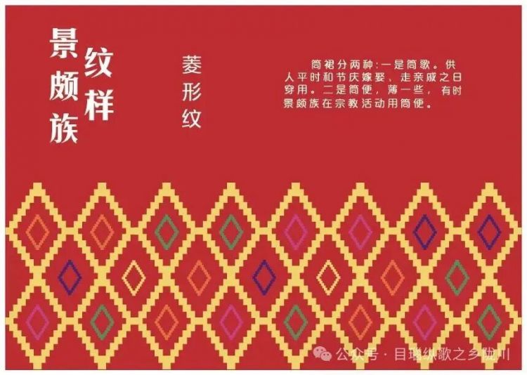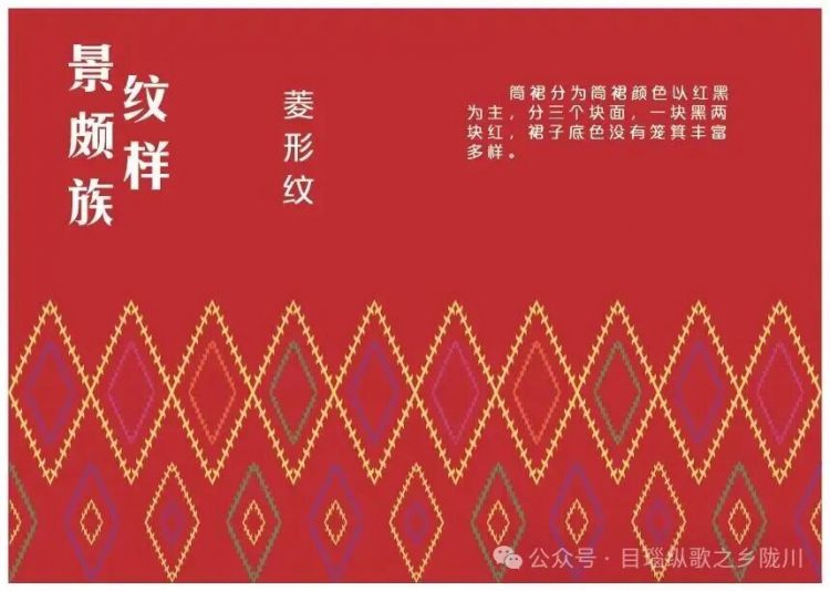景颇族的筒裙多以大红色为基调,上面用黄、黑、白、蓝、绿色的棉、毛线织出大大小小相间、相套的以菱形为主的几何形图案,精巧别致。