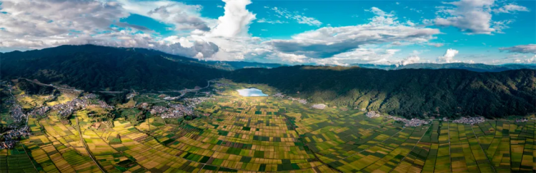 山木青翠,稻田丘块相连