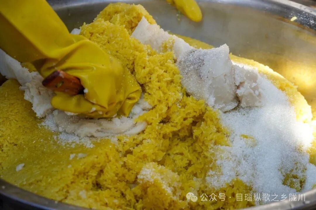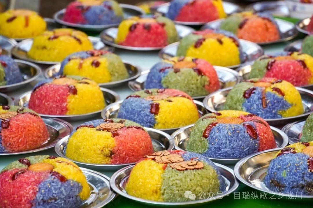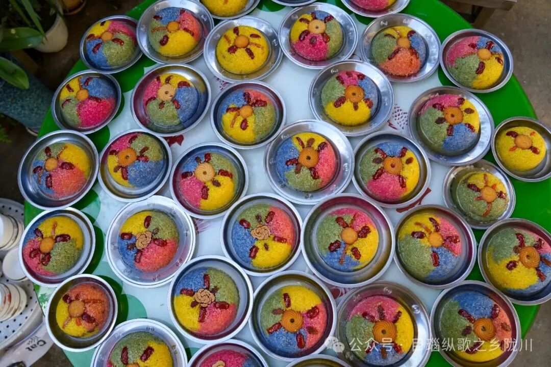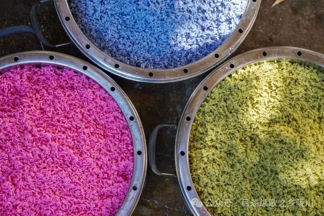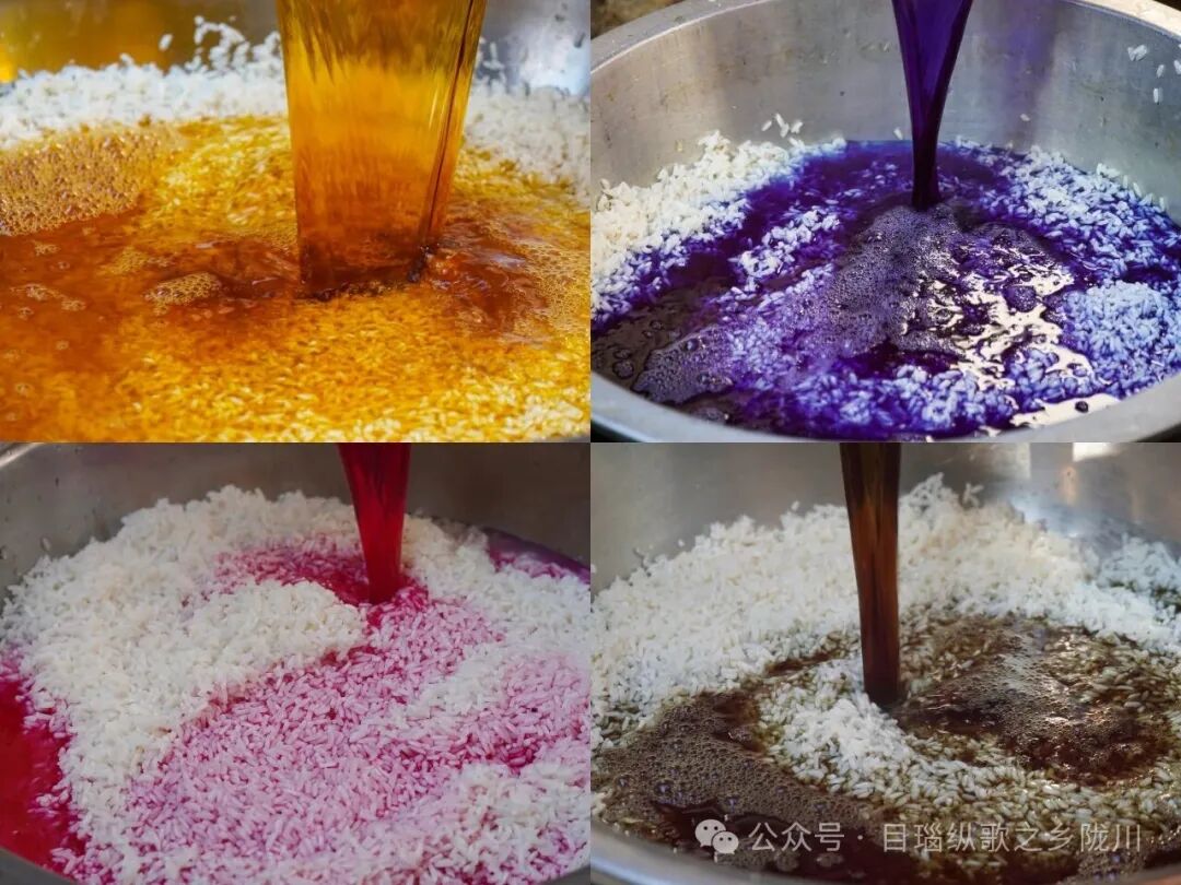 最后盖一层彩色糯米饭压实