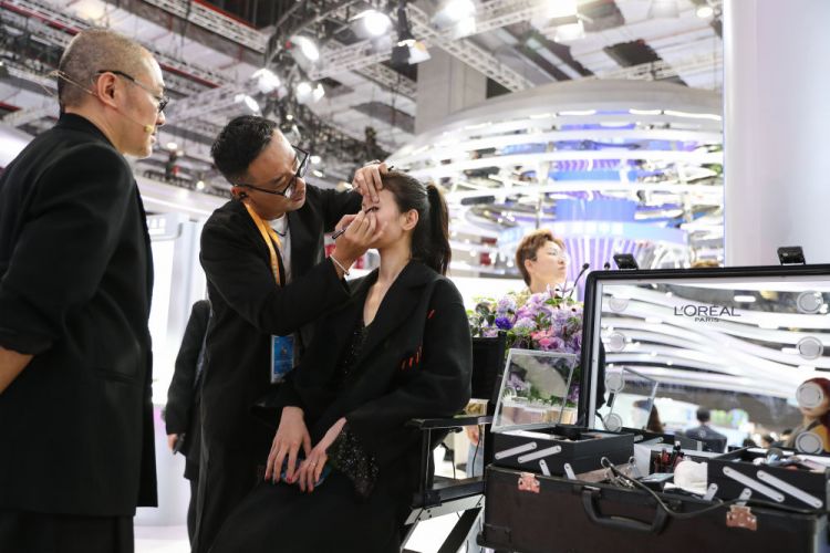 2025年11月7日,观众在第八届进博会消费品展区欧莱雅展台体验美妆服务。欧莱雅是进博会八届“全勤生”。本届进博会共有170家企业和27家机构成为签约参展的八年“全勤生”,进博会“全勤生”们的参会热情印证了中国持续推动高水平对外开放的坚定姿态,也彰显了中国为各国企业提供共享中国市场宝贵机遇的诚意。