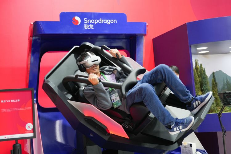 11月6日,参观者在第八届进博会技术装备展区高通展台体验XR设备。本届进博会展示科技、工业、医疗等领域的高端装备、前沿技术和创新产品,致力于引领行业创新趋势。
