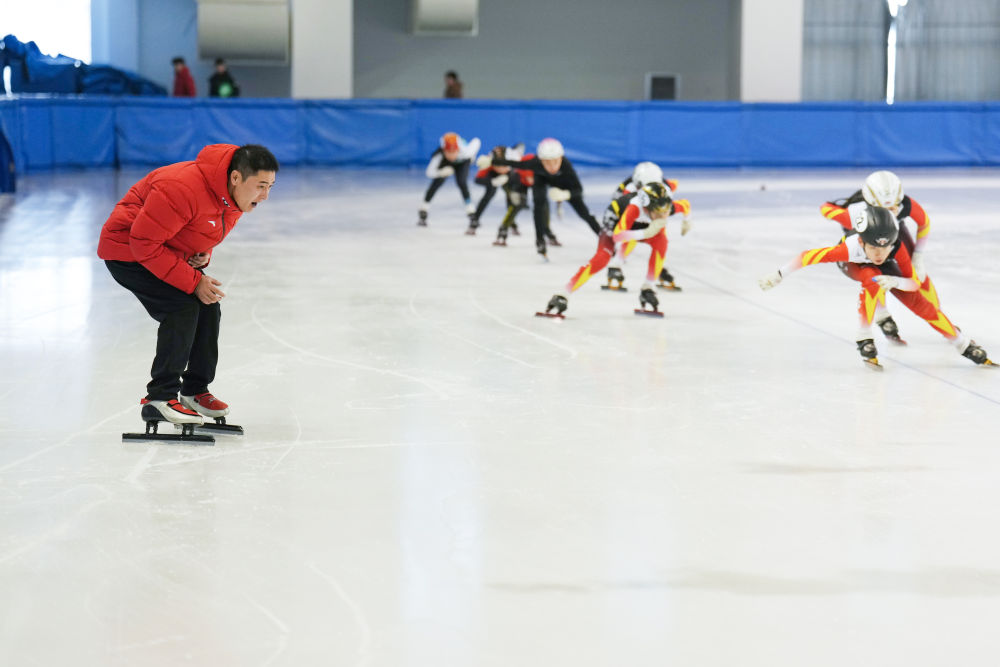 2025年1月24日,短道速滑教练姚忠华(左)在黑龙江省七台河市短道速滑馆指导运动员进行冰上训练。十余年来,姚忠华累计执教培养过200余名运动员。七台河市拥有“奥运冠军之城”的城市名片,在这里,教练员们一起筑梦冰场,为我国冰雪人才的储备奉献自己的力量。