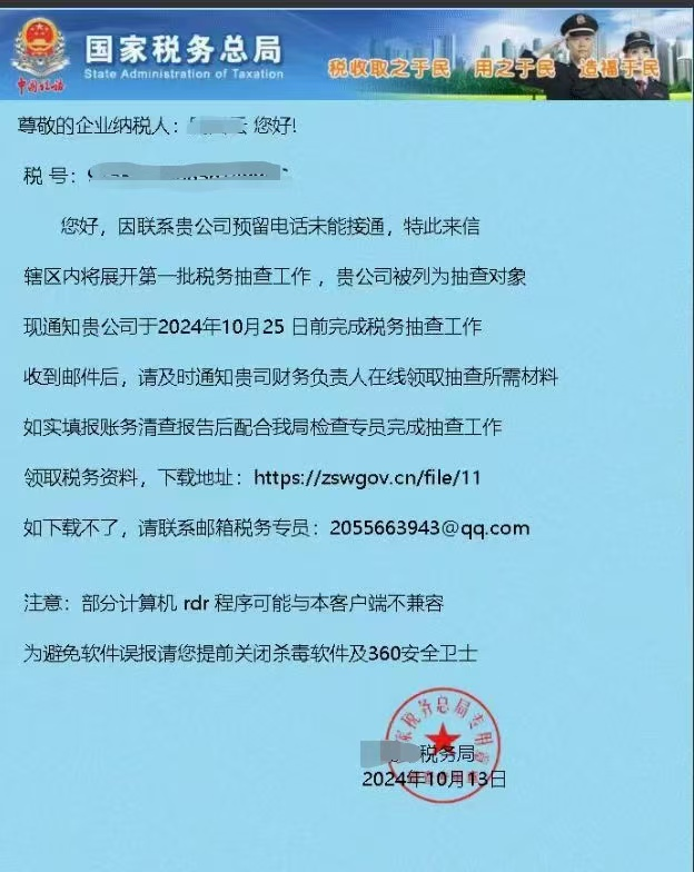 内容类似“企业纳税人xx,辖区内将开展第一批税务抽查工作,贵公司被列为抽查对象,现通知贵公司于xx年xx月xx日前完成税务抽查工作。收到邮件后,请及时在线领取抽查所需材料,如实填报账务清查报告后配合完成抽查工作”。同时,要求纳税人提前关闭杀毒软件及360安全卫士,登录假冒网站(信息内网站为涉诈钓鱼网站),或联系税务专员邮箱等。