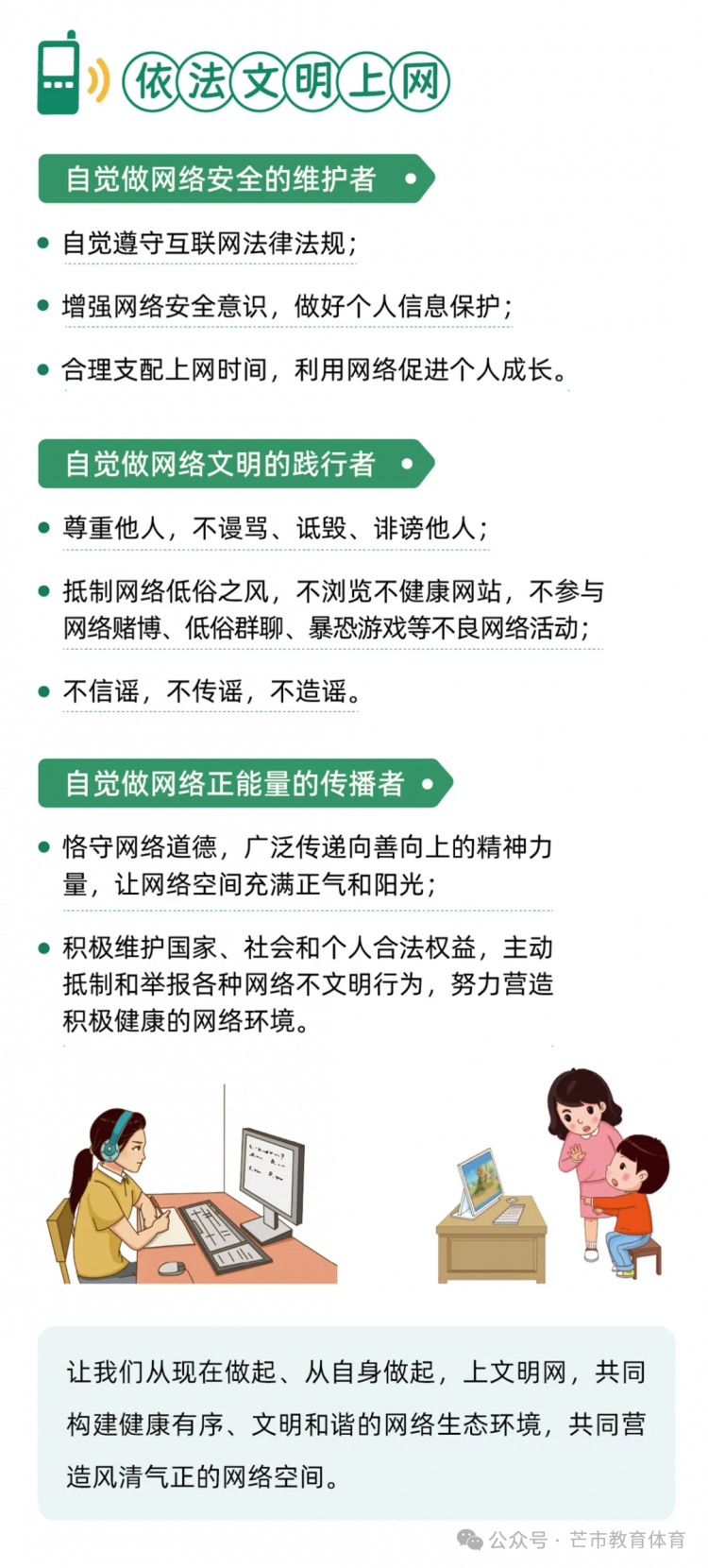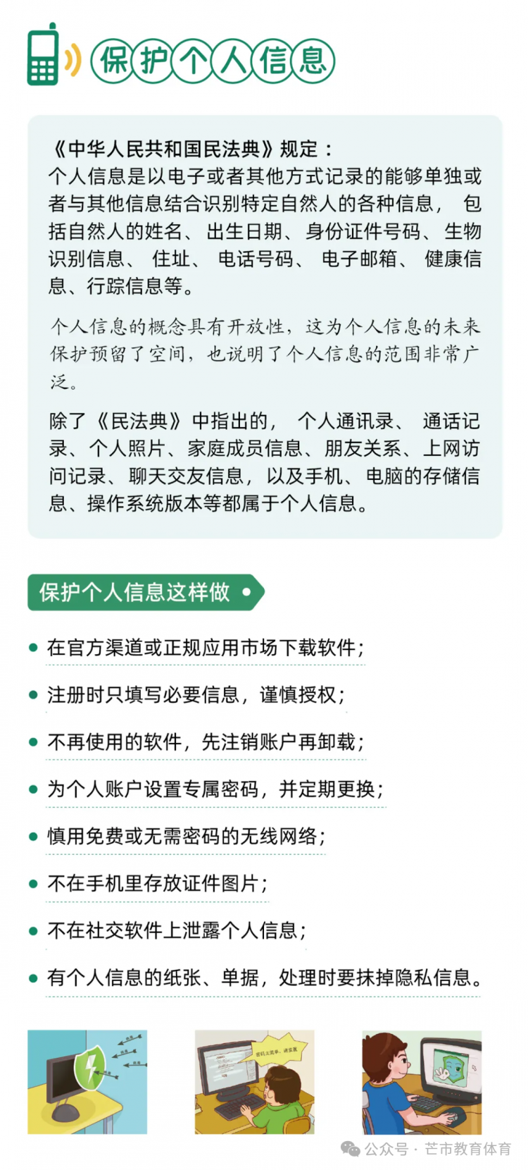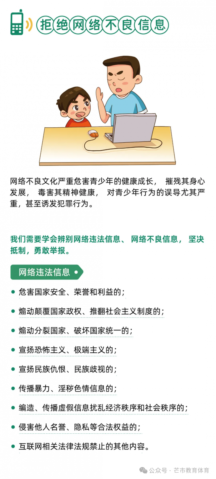 尊敬的家长朋友: 您好! 2025年9月15日至21日是国家网络安全宣传周,今年的活动主题为“网络安全为人民、网络安全靠人民 —— 以高水平安全守护高质量发展”。 为切实引导孩子们增强网络安全意识、提升风险防范技能,养成文明上网、安全用网的良好习惯,值此宣传周之际,希望能与各位家长携手并肩,共同筑牢家庭网络安全防线,为孩子的健康成长保驾护航。 一、做“安全引导员”,筑牢安全防线 1.警惕高频诈骗:向孩子讲清“免费游戏皮肤”“扫码领红包”“教育退费”等常见骗局,提醒其不透露家庭支付信息、不随意转账或游戏打赏。 2.守护个人隐私:教育孩子不轻易公开姓名、学校、住址等真实信息,不随意在社交平台晒定位、露隐私,注册APP时拒绝填写无关敏感信息。 3.辨别不良信息:引导孩子远离暴力、低俗内容,学会甄别网络谣言与极端言论,不传播、不模仿不良行为。 二、做“习惯养成师”,守护健康成长 1.共定上网规则:与孩子协商每日屏幕使用时长,明确睡前1小时不使用电子设备,避免沉迷网络影响学业与睡眠。 2.善用防护工具:为手机、电脑开启“青少年模式”,启用“家长控制”功能,安装正规防护软件并定期更新,过滤不良内容。 3.丰富现实生活:鼓励孩子多参与户外活动与集体项目,减少对虚拟空间的依赖,避免形成孤僻、淡漠的“网络性格”。 三、做“榜样示范者”,凝聚家校合力 1.树立良好标杆:家长以身作则践行健康上网习惯,不在孩子面前沉迷刷短视频、发表不当言论,用行动传递文明上网理念。 2.保持开放沟通:定期与孩子讨论网络见闻,了解其社交动态,当孩子遭遇网络欺凌或诈骗时,及时提供心理支持并第一时间求助或报警。 3.联动学校防控:学校将通过主题班会、实践活动等方式强化网络安全教育,若您发现孩子有不当上网行为或网络安全疑问,欢迎随时与我们联系。 家长朋友们,以下这份网络安全知识手册,建议您与孩子一同阅读学习,让我们以“家校共育”的力量,把网络安全的种子播撒在孩子心中! 芒市教育体育局 2025年9月18日