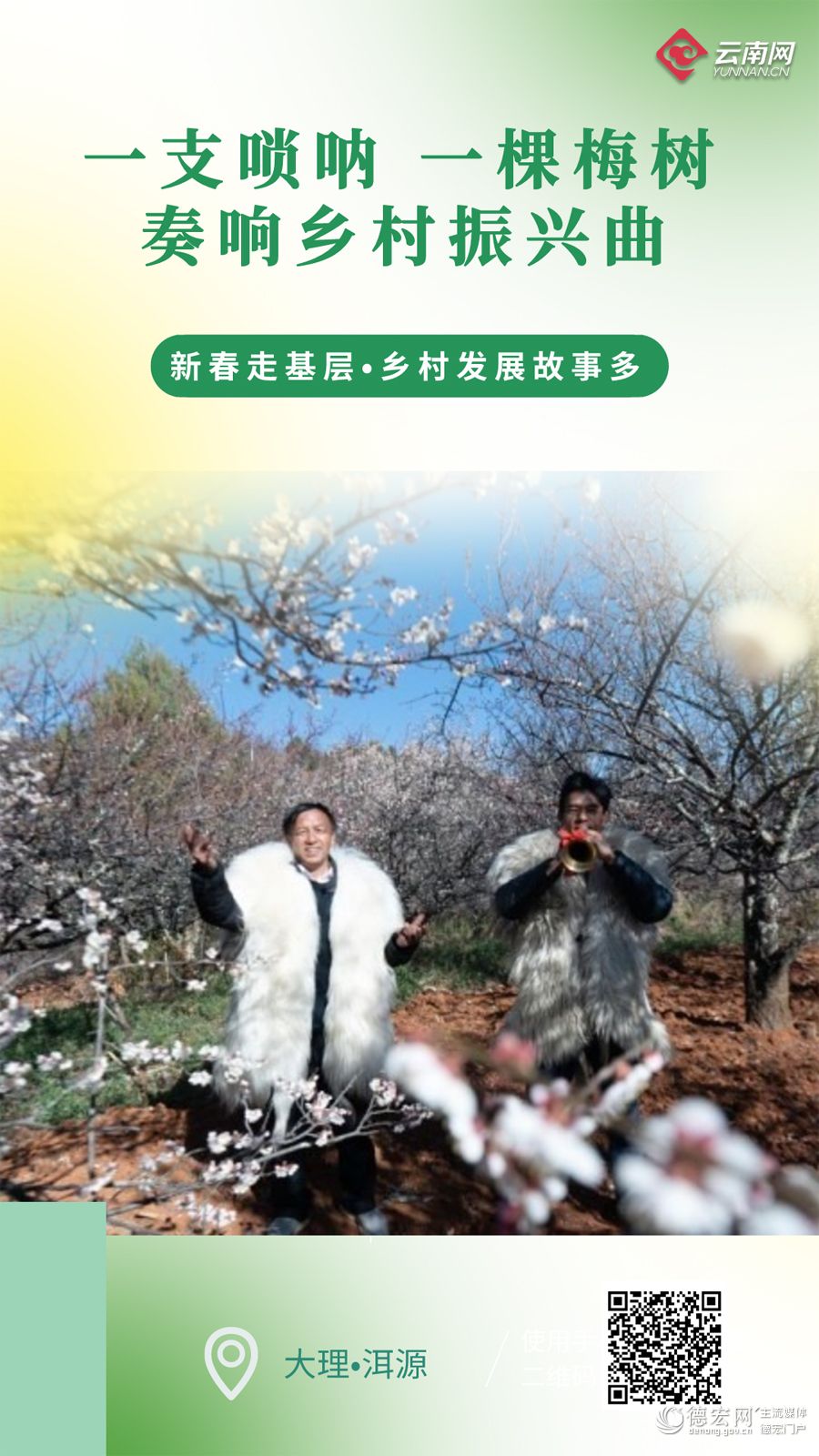 大理白族自治州洱源县松鹤村是远近闻名的“梅子之乡”和“唢呐之乡”。临近春节,松鹤村1.2万亩梅花进入盛花期,吸引了众多游客。另外,由于春节前后客事、喜庆节日比较多,唢呐也给松鹤村带来不错的收入。一支唢呐、一棵梅树,成为松鹤村的致富法宝。